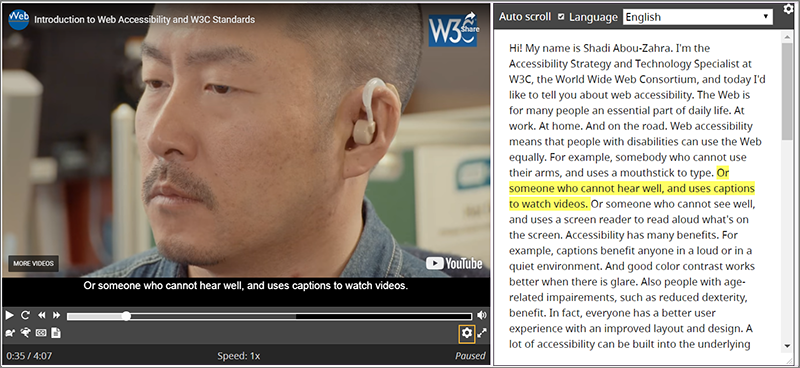 Les transcriptions interactives surlignent les parties de texte au moment où elles sont prononcées. Les utilisateurs peuvent sélectionner du texte dans la transcription et atteindre cet instant dans la vidéo. Il s’agit d’une fonctionnalité du lecteur multimédia. Elle utilise le fichier de sous-titres.